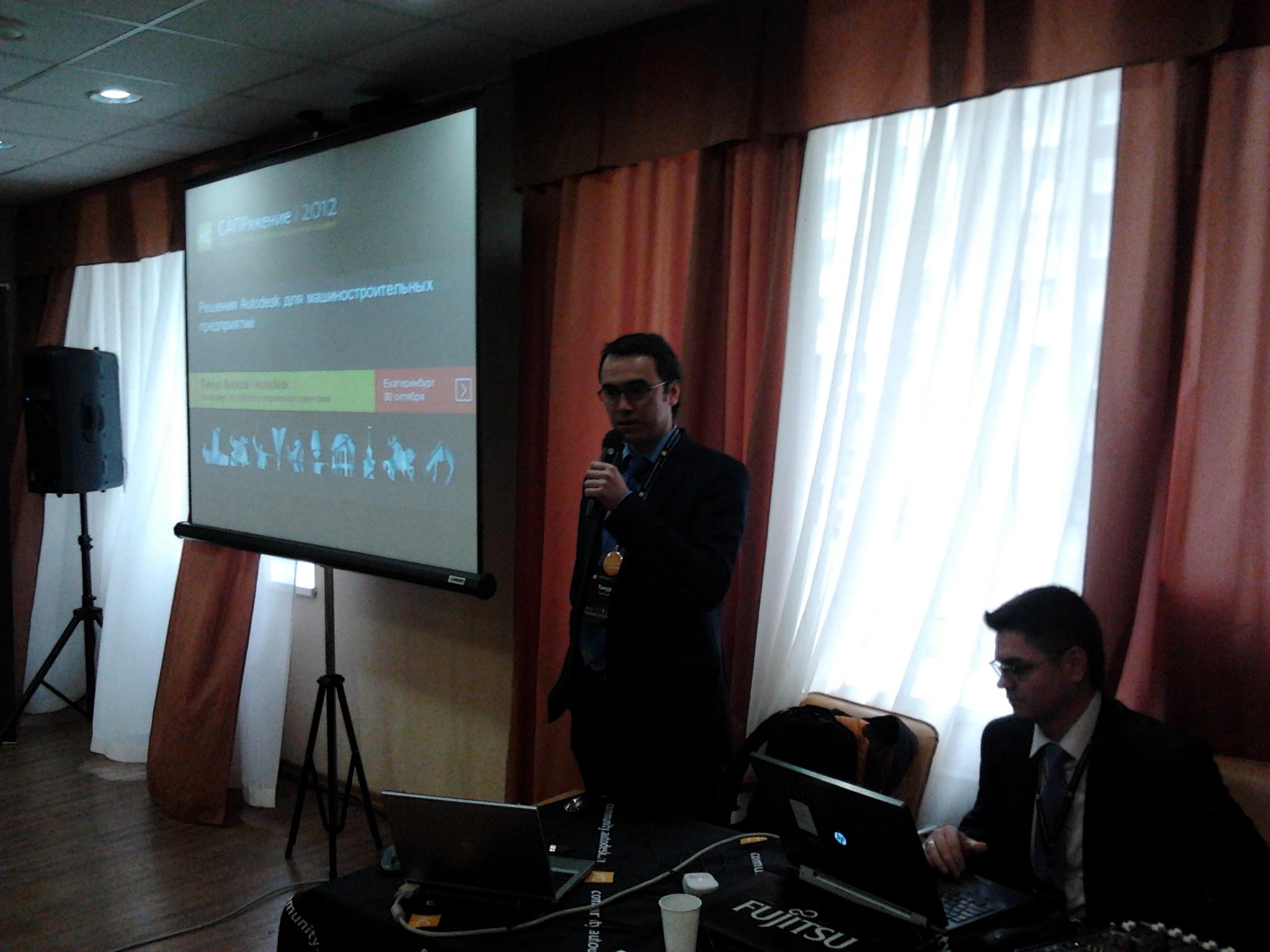 А потом уже я со своим докладом про любимый листогиб и не только :) Все доклады прошли "на ура". Единственное замечание, что про связь Inventor и систем EDA интересно и понятно было единицам, но благодаря красивым картинкам смотрели все. Самыми востребованными и породившими кучу вопросов оказались, как я и предполагал, "вкусные" доклады о проектировании сварных конструкций и о поиске оптимальных конструкторских решений.